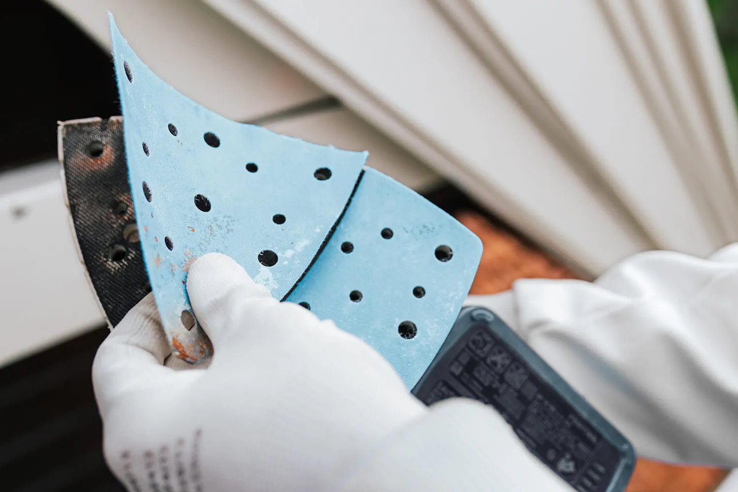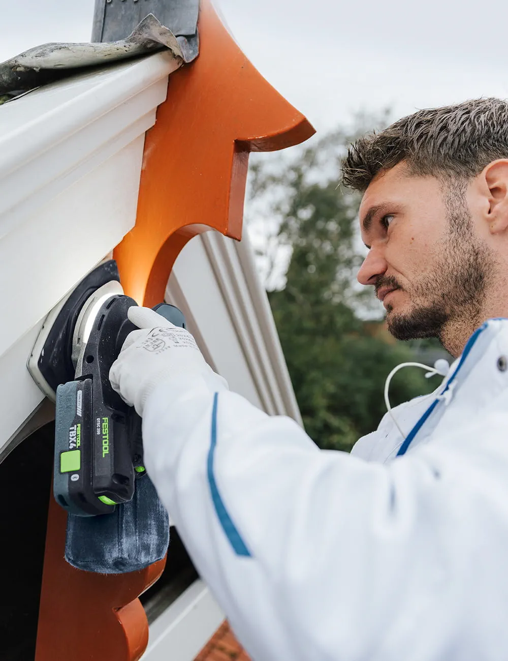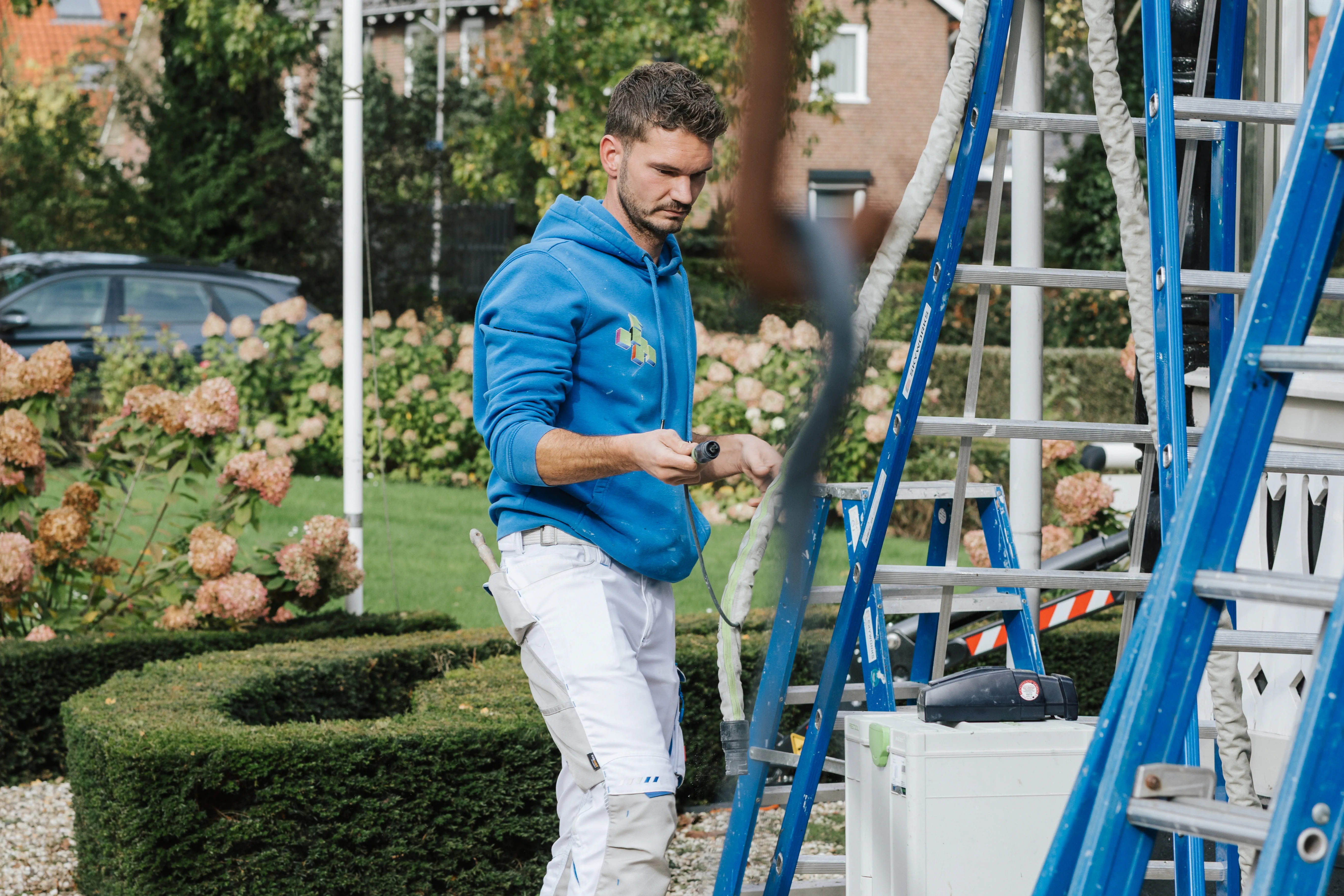 De jonge schilder vindt het erg belangrijk om buiten op het stootbord te werken met een stofafzuiger of Stofopvangzak. Zo kan hij schoner werken en zichzelf beschermen. "Veel van mijn collega's onderschatten dit als ze buiten werken," roept hij van boven naar beneden. "Maar hier in Nederland heb je altijd windvlagen die, in het ergste geval, stof in je gezicht blazen als je aan het schuren bent."