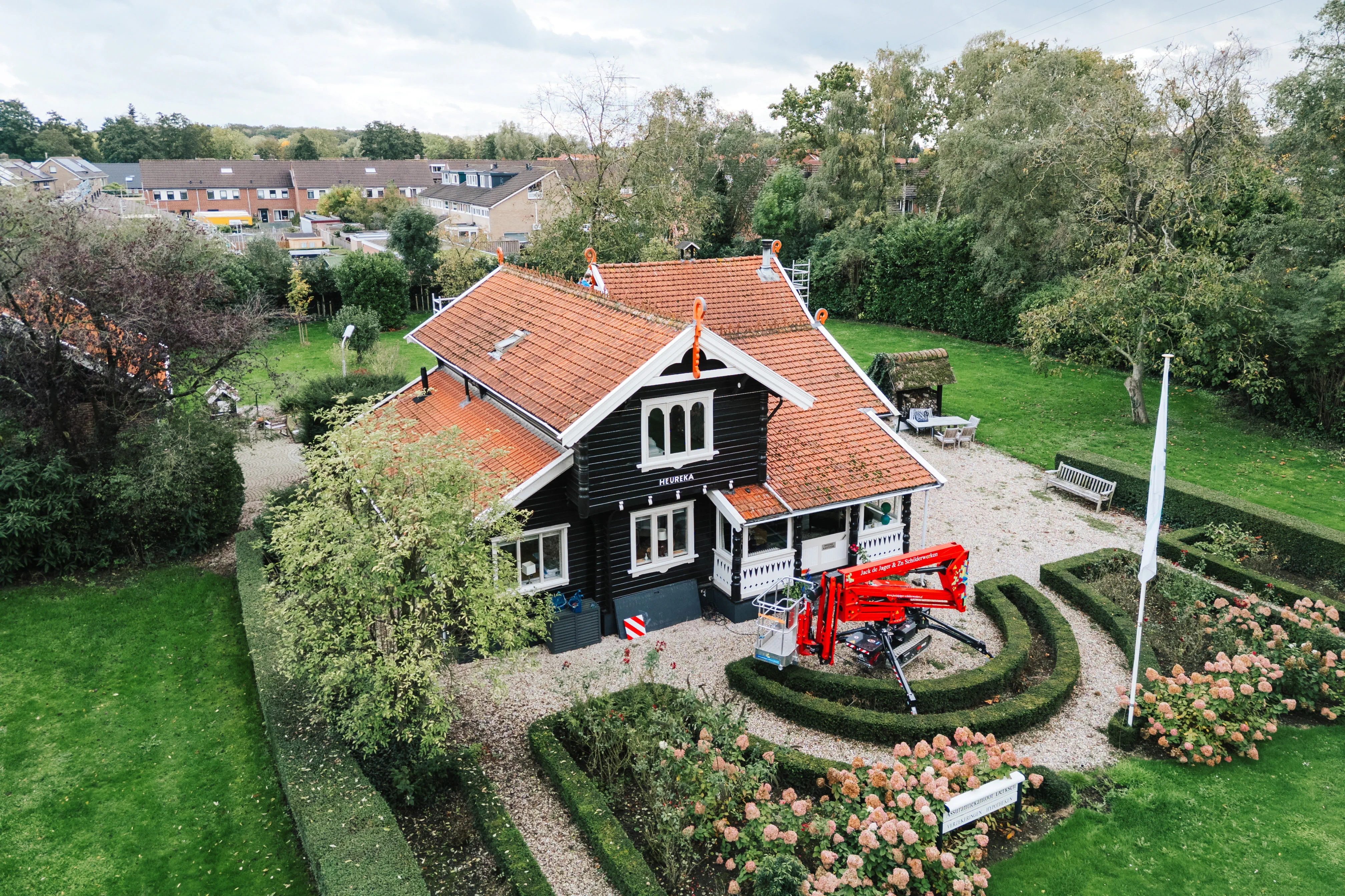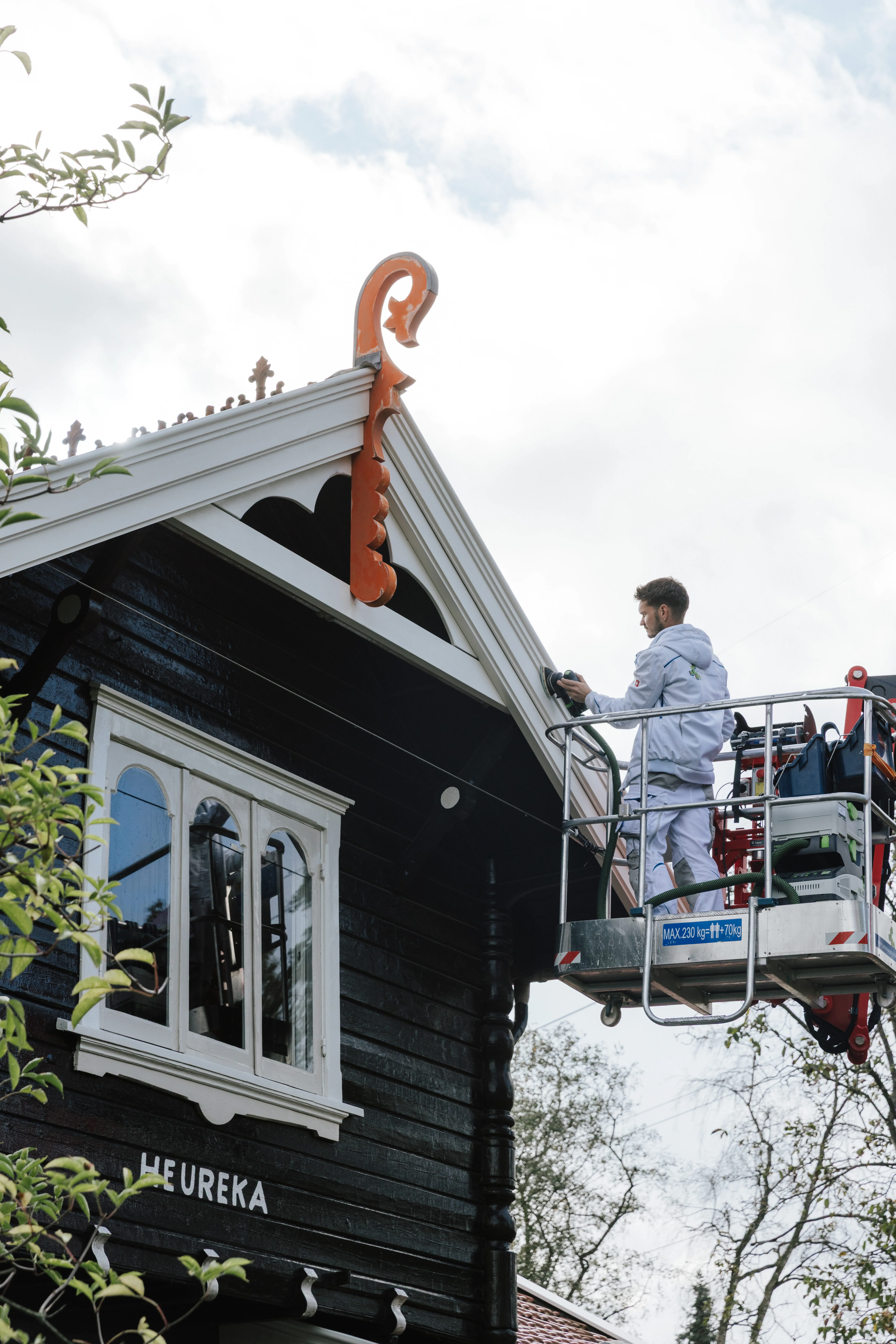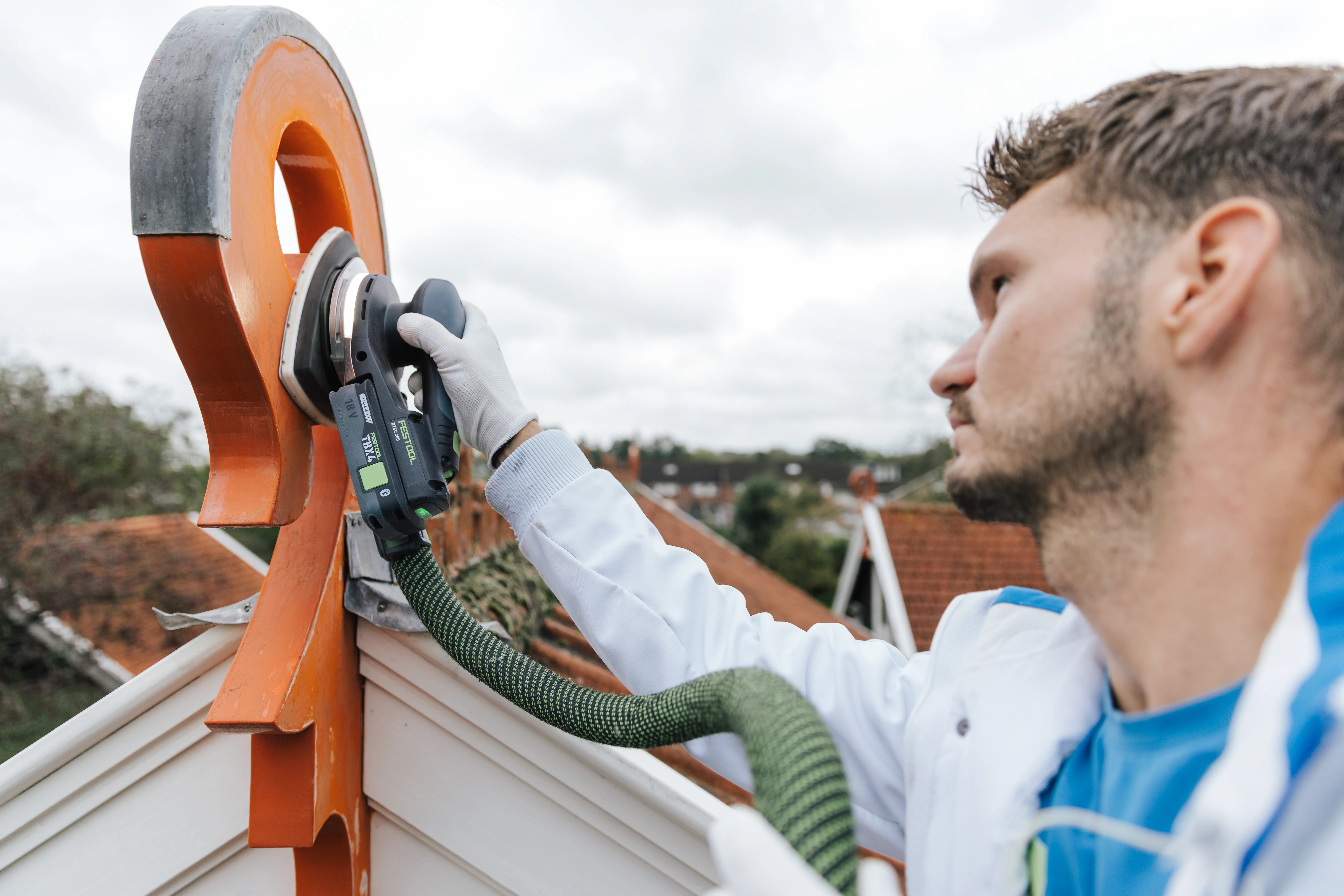 De favoriete werkplek van Luke de Jager is hoog op de Steiger. Hij is voorzichtig bezig met het afschuren van het karakteristieke dakornament, dat in een gedempte oranje tint op de nok van het dak troont. Het houten oppervlak is verweerd en de coating bladdert al af. Met de Deltaschuurmachine DTSC 200 kan Luke ook gebogen, geprofileerde en conische oppervlakken maken. Als het bijzonder schuin wordt, gebruikt hij de DTSC 400.