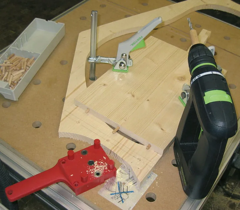 Boren van de pluggaten (ø 6 mm) in het dwarshout van de zijwanden met behulp van een plugsjabloon.
