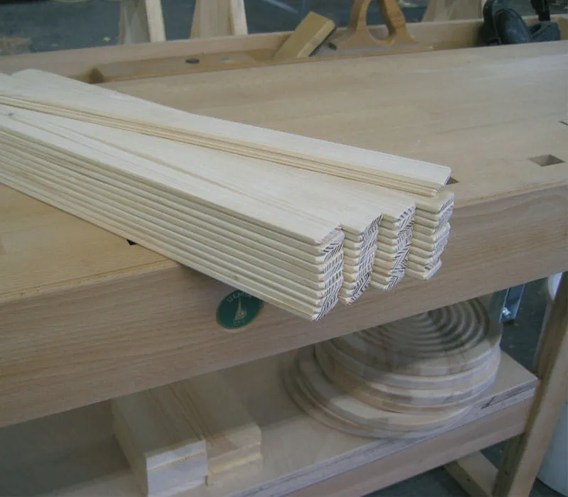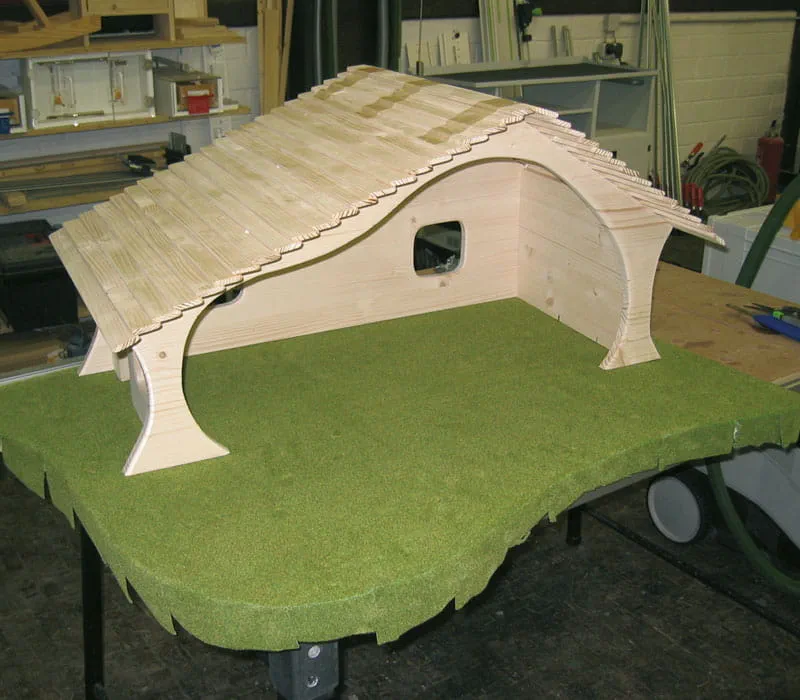 Terwijl de lijm droogt de daklijsten (per meter verkrijgbaar in de houthandel) voor het dak op lengte zagen en de kanten breken.