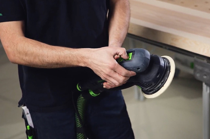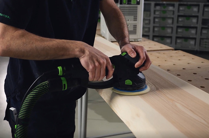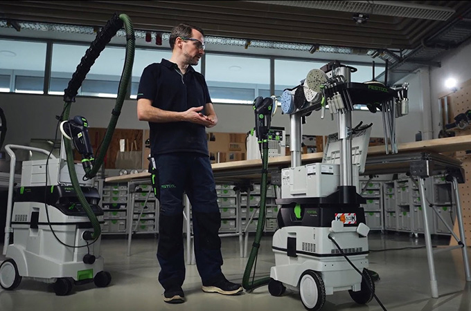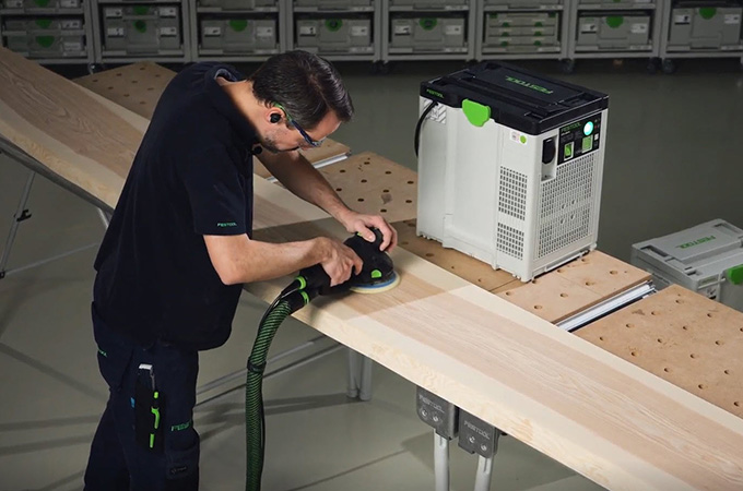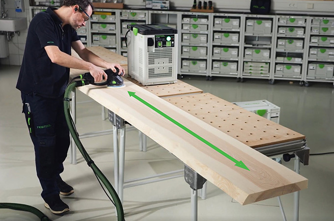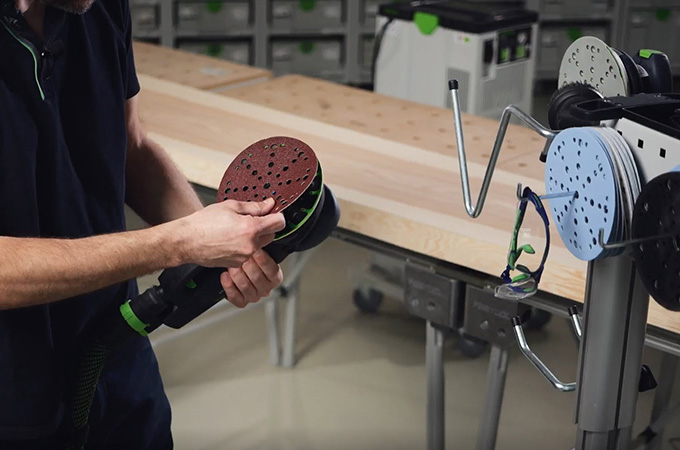 Geschaafde houten oppervlakken hebben zogenaamde messporen, ook wel schaafsporen genoemd, veroorzaakt door de Schaafmessen. Deze moeten worden geschuurd voordat de oppervlaktecoating wordt aangebracht. Dit resulteert in een gladder, homogener oppervlak en de oppervlaktecoating heeft een betere grip of kan beter in het hout dringen. Als u geen grote stationaire schuurmachine hebt, kunt u deze stap uitvoeren met een handschuurmachine. De ROTEX is hier ideaal voor omdat hij grof schuren en excentrisch schuren in één machine combineert. Aangezien dit werk voornamelijk in de werkplaats wordt uitgevoerd, is het voordelig om de werkplek hierop in te richten. Daarom willen we hier kort onze systeemaccessoires bespreken.
