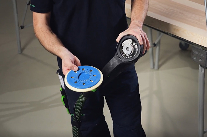 De schijf op de ROTEX kan zeer snel vervangen worden met behulp van de FastFix interface. Trek hiervoor eerst de stekker uit het stopcontact en zet dan de omschakelaar op grof schuren. Vervolgens wordt de spilstop bediend. Vervolgens wordt de schijf zonder gereedschap linksom gedraaid.