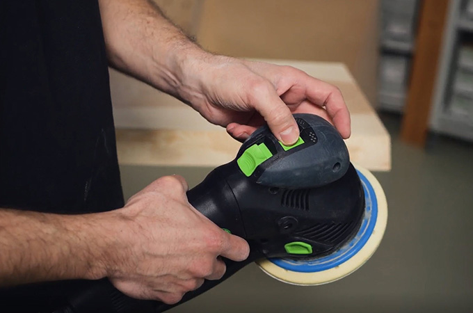 Bij het fijnschuren moeten de resulterende schuursporen opgeschuurd worden zodat ze na de oppervlaktebehandeling niet meer zichtbaar zijn. Hiervoor wordt de korrel P120 eerst op de machine gelaten. De ROTEX wordt op de excentrische beweging gezet (fijnschuren). De schuursporen van het grof schuren worden dan verwijderd. Ook hier wordt in een kruisbeweging gewerkt.