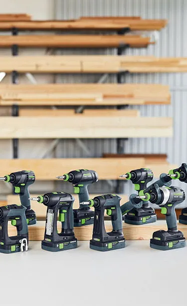 Les visseuses sans fil Festool s'intègrent parfaitement au système. Nos accessoires système tels que le système de changement rapide, le Renvoi d'angle, la Butée excentrique, la Butée de profondeur, les packs de batteries, les chargeurs, les embouts et les forets pour les applications les plus diverses rendent votre travail avec une visseuse sans fil Festool encore plus efficace.