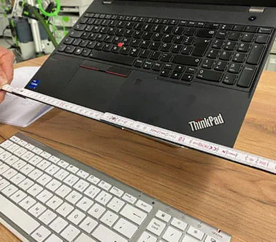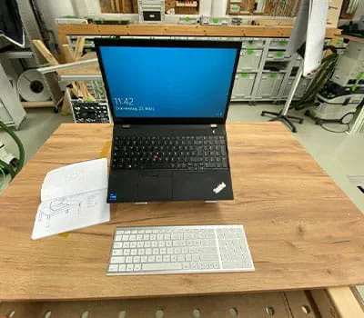Déterminez la profondeur nécessaire pour le casier sous le plateau et réfléchissez aux objets que vous souhaitez y ranger. Mesurez votre ordinateur portable. Dessinez maintenant les angles de la découpe à réaliser.
