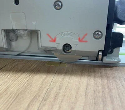 Deux étapes sont nécessaires à la réalisation d'un évidement pour obtenir un résultat de coupe parfait jusque dans les angles. Nous commençons par l'incision, puis procédons à la coupe avec la lame de scie principale. Pour cela, nous activons d'abord l'inciseur en mettant le levier avant sur « ON ». L'inciseur est maintenant activé.