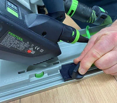 Placez le rail de guidage sur votre repère. Utilisez deux serre-joints à levier ou à vis pour fixer le rail de guidage sur votre plateau. Placez ensuite la scie plongeante avec inciseur sur le rail et réglez les mâchoires de guidage de manière à éliminer tout jeu. Centrez l'inciseur par rapport à la lame de scie principale, comme décrit dans la notice d'utilisation de la scie.