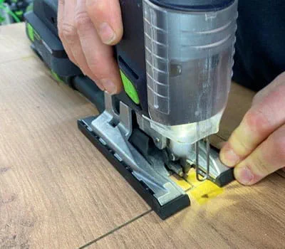 Nous devons maintenant couper complètement les angles. Pour éviter ici aussi les éclats, veillez à ne pas utiliser une lame de scie sauteuse plus large que la lame de scie circulaire. Veiller à procéder aux réglages nécessaires sur la scie. Monter le pare-éclats et désactiver la course pendulaire.