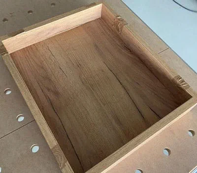 Nous retournons le plateau (dessous vers le haut) et ajustons la position du casier dans notre découpe. Assemblez maintenant les parties avec de la colle ou des chevilles et serrez-les jusqu'à ce que la colle soit sèche.