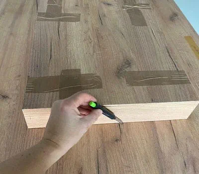 En l'occurrence, nous travaillons sur un plateau de table contreplaqué. Nous devons le fixer à la table de travail en position surélevée afin de ne pas l'entailler (voir image)
