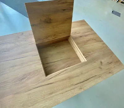 Que ce soit par manque de place ou pour des raisons esthétiques, il peut être judicieux d'aménager sans trop de mal un rangement discret et pratique dans ou sous une table, ou encore derrière un mur/un renfoncement mural. En l'occurrence, notre choix s'est porté sur un plateau de table en aggloméré contreplaqué. L'objectif consiste à réaliser un évidement de taille adaptée en veillant à l'absence d'éclats des deux côtés, étant donné que la partie découpée sera remise exactement à sa place pour couvrir le rangement encastré. Nous obtiendrons ainsi un résultat de qualité et le volet sera à peine visible.