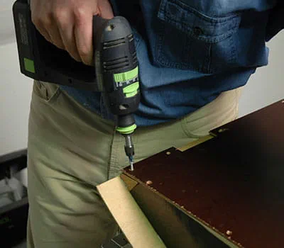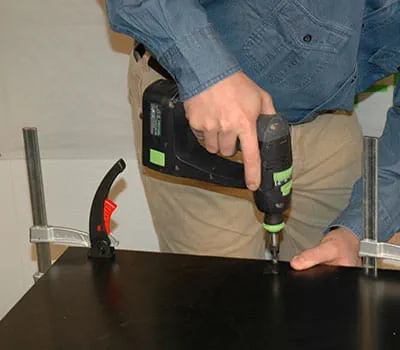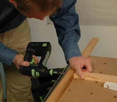 Après le vissage des cadres formant la sous-structure, mettez en place les habillages intérieurs (pos. 2, 7, 13). Fixez les panneaux avec des serre-joints et percez les trous destinés aux vis. Vissez les panneaux sur la sous-structure avec des Spax (3,5 x 20 mm).
