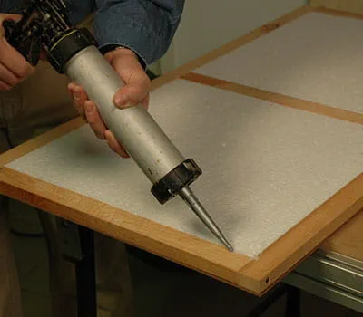 Après vissage de tous les panneaux intérieurs et du panneau de fond (pos. 1), découpez l'isolation en polystyrène et insérez les plaques dans les encadrements. Tracez des repères aux emplacements de la sous-structure sur les habillages extérieurs (pos. 6, 12). Ceux-ci doivent être fixés au reste de la paroi par collage (avec de la colle PU). Serrez maintenant les différents éléments de la paroi avec des serre-joints.