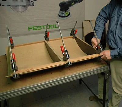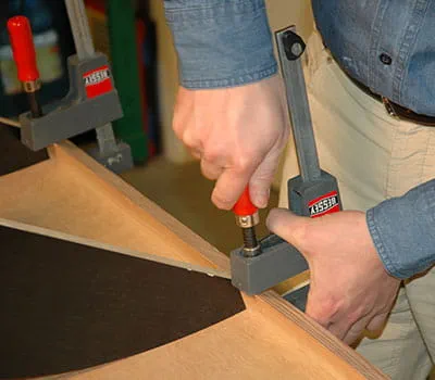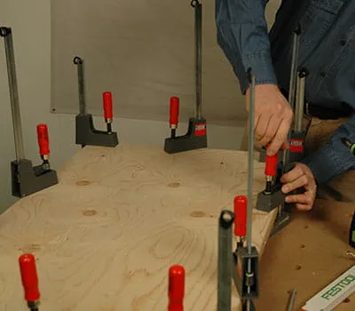 En appuyant dessus, déroulez la sous-structure sur l'habillage et fixez-la d'abord au centre, puis au niveau de la deuxième baguette de bordure, en utilisant des serre-joints. Pour obtenir un bon résultat, utilisez le plus grand nombre de serre-joints possible. Si des interstices sont encore visibles après séchage, utilisez de la silicone pour les colmater à l'intérieur du toit.