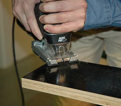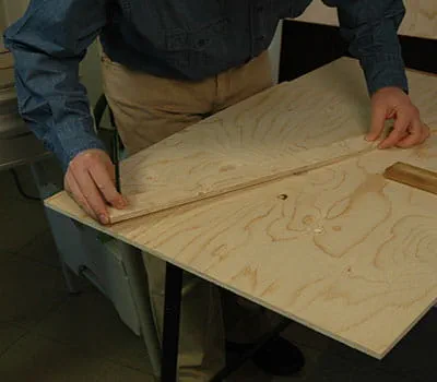 Faites découper les panneaux de contreplaqué selon les indications fournies dans la liste de matériel. Si vous voulez découper vous-même chacun des panneaux, le plus simple est de poser sur le sol des lattes servant de support, puis de découper les panneaux avec une scie plongeante et un rail de guidage. L'expérience a montré qu'il est préférable de commencer par la réalisation des deux parois latérales et
