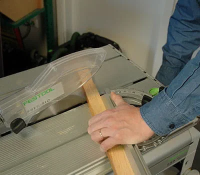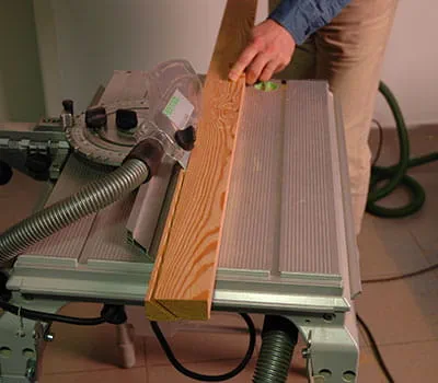 Pour obtenir une arête de coupe précise, réglez la course pendulaire de la scie sauteuse sur la position 1. Avec la scie circulaire sur table, coupez en biseau dans la longueur les baguettes de bordure de toit. Pour les coupes longitudinales dans du bois massif, il est indispensable d'utiliser une lame de scie à grosse denture. Mettez les baguettes à longueur avec la scie circulaire sur table.
