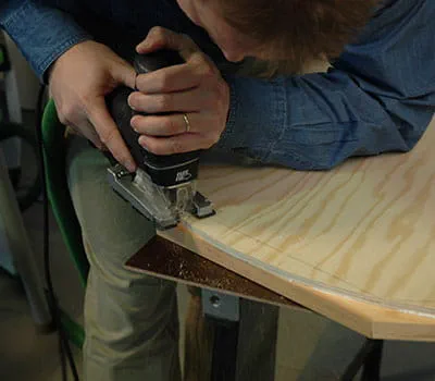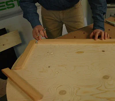 À cette étape, il est important que les lattes dépassent suffisamment à l'extérieur pour obtenir un chant supérieur de niveau homogène lors de la découpe ultérieure du contour arrondi. Avec un rapporteur, mesurez l'angle exact auquel les baguettes doivent être coupées. Réglez l'angle de la scie mobile et coupez le premier côté des baguettes.