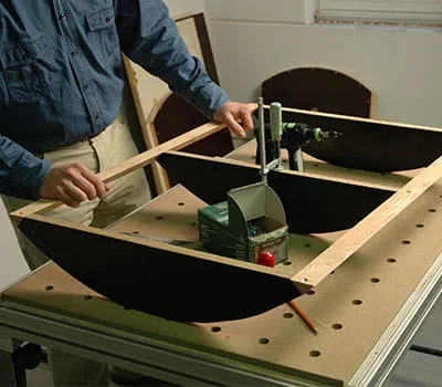 Tracez sur les supports de toit des repères indiquant la largeur des baguettes de bordure de toit et découpez les angles avec la scie circulaire sur table. Tracez des repères aux emplacements des trous d'assemblage pour les vis entre les baguettes de bordure et les nervures puis percez les trous (D = 4 mm). Vissez les uns aux autres les supports et les baguettes de bordure. Les supports de toit et l'habillage extérieur du toit doivent être assemblés par collage.