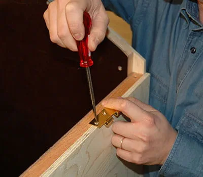 Une fois que le toit a été posé et sa position ajustée, vous devez tracer un repère à l'emplacement des charnières. Avec un foret à langue d'aspic, apposez un marquage sur l'extérieur de la paroi au niveau du bord inférieur des charnières. Retirez à nouveau le toit et vissez les charnières. Il est maintenant possible de monter la niche dans son intégralité et de poncer tous les chants et les angles. Désassemblez la niche et poncez toutes les surfaces extérieures avec une ponceuse excentrique.