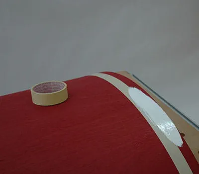 Dernier ponçage : P 180. Selon vos souhaits personnels, appliquez maintenant sur les surfaces une lasure résistant à l'eau ou du vernis. Veillez à respecter les consignes de mise en œuvre fournies par le fabricant ! Avec une scie à onglet, coupez les baguettes d'angle en plastique qui resteront sur la niche, où elles seront collées sur les coins avec de la colle PU (Pattex X‑PERT). Pour la fixation, utilisez du ruban adhésif. Retirez le ruban adhésif du bord avant du toit. Peignez le bord en blanc.
